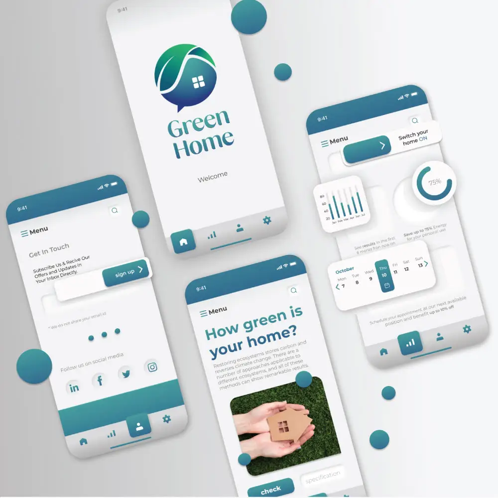 The design of our green energy management app for web and mobile platforms embodies simplicity, intuitiveness, and functionality. With a clean and modern interface, users can effortlessly navigate through features aimed at empowering them to monitor and optimize their energy usage. Bright, eco-friendly colors evoke a sense of sustainability and environmental consciousness.